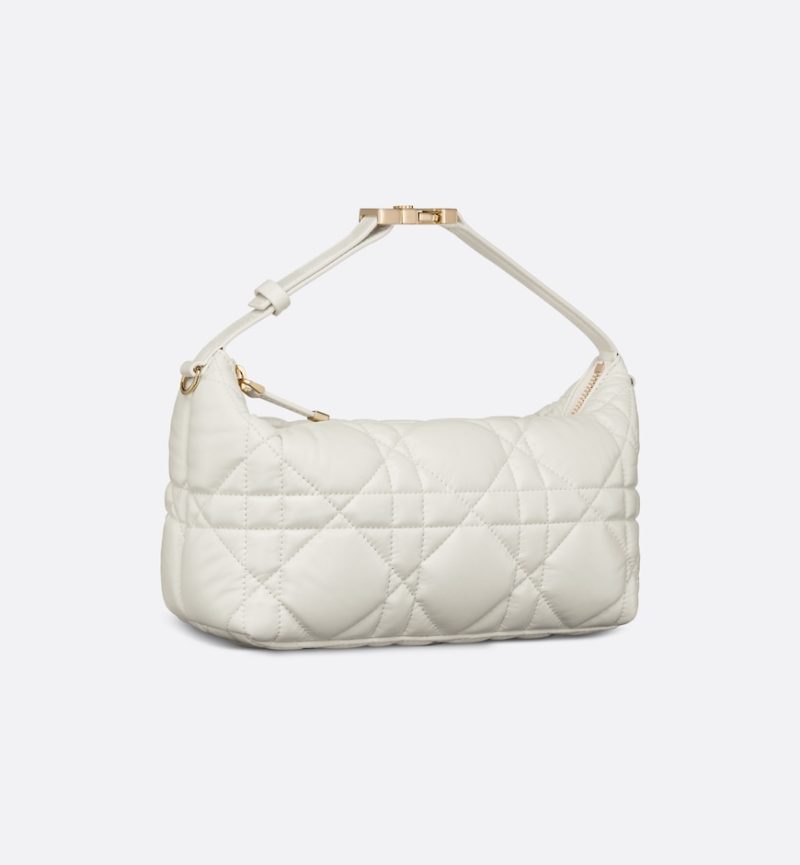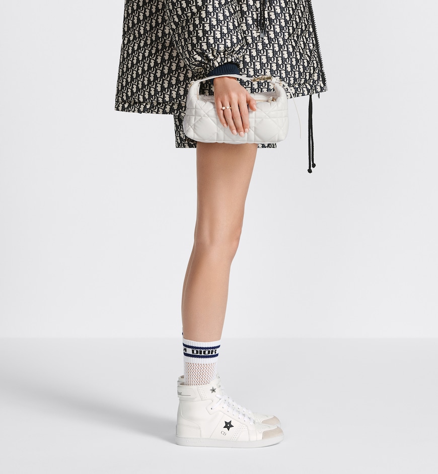 Maria Grazia Chiuri’s DiorTravel Nomad pouch is a modern hybrid design. Crafted in latte calfskin, it stands out with a unique Macrocannage quilted effect, and a spacious and flexible form that will accommodate all the essentials. The medium style can be carried by hand or worn over the shoulder thanks to the top handle, complete with a military-inspired pale gold-finish metal CD buckle, while one of the House’s embroidered shoulder straps can be attached to the side rings.