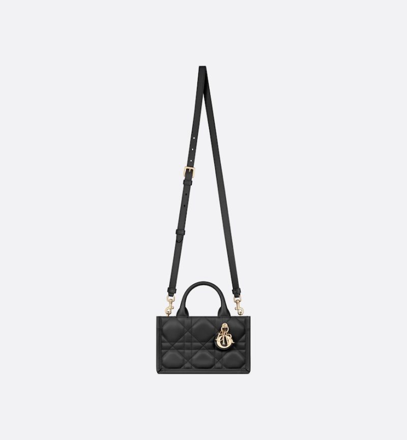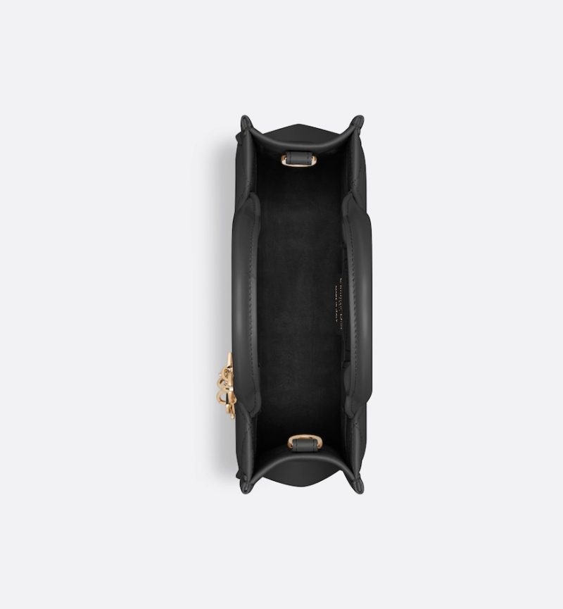 The Dior Book Tote is a House classic and original design by Maria Grazia Chiuri, Creative Director of Christian Dior. Constructed in black calfskin, it is embellished with hallmark Macrocannage topstitching and accented by pale gold-finish metal D.I.O.R. charms adorning one of the top handles. Exemplifying House savoir-faire, the miniature style features an adjustable and removable strap that allows it to be carried by hand, worn over the shoulder or crossbody.