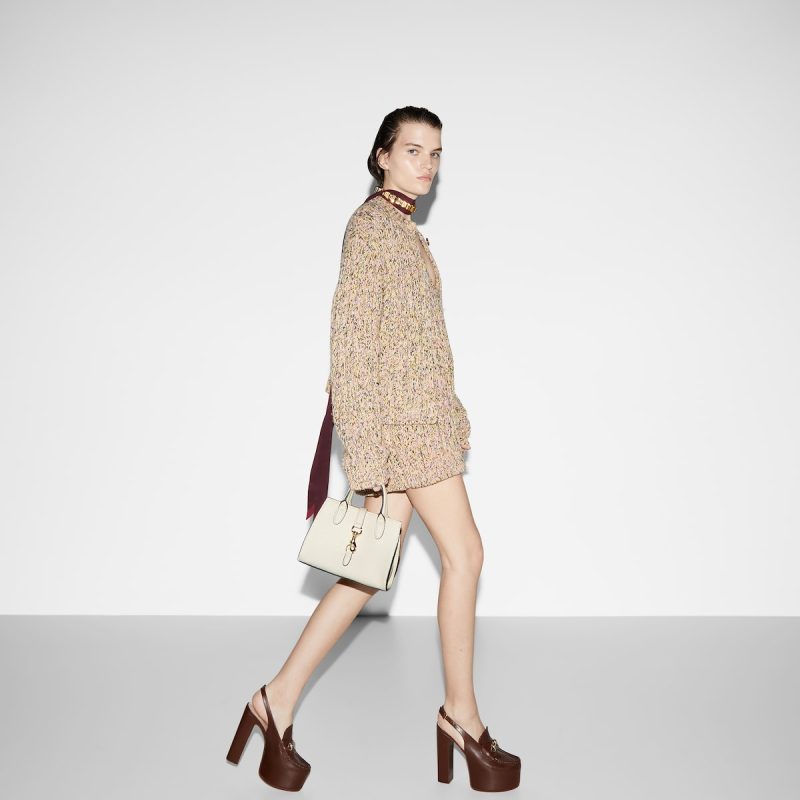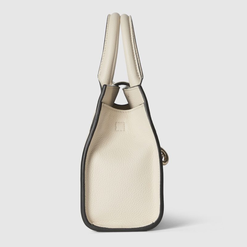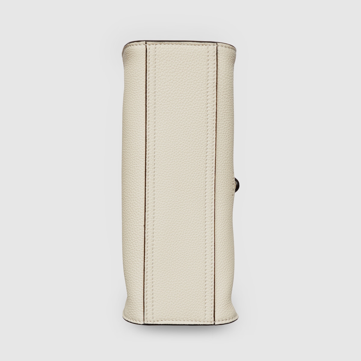 This small tote design continues to feature the snap hook closure, inspired by the styles first presented in Spring Summer 2024. The sophisticated leather in ivory has a distinctive natural grain. This top handle bag holds daily essentials, and is ideal for any occasion with its detachable and adjustable shoulder strap.
