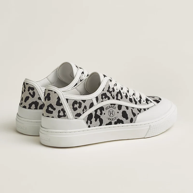 Sneaker in printed leopard canvas and calfskin with signature ‘Herm??s Paris’ stencil.