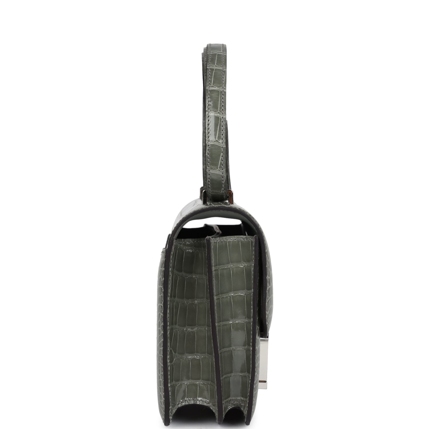 This Constance 1-18 Gris Ciment Shiny Alligator Mississippiensis leather with palladium hardware, tonal stitching, metal “H” snap closure, and an adjustable strap.
