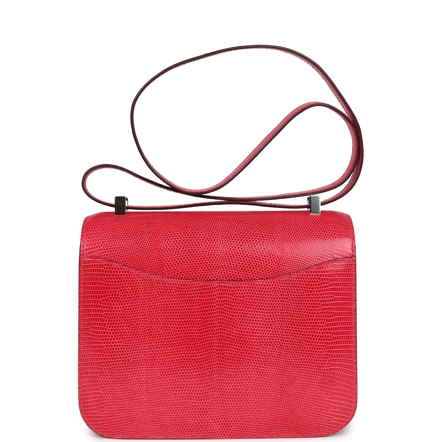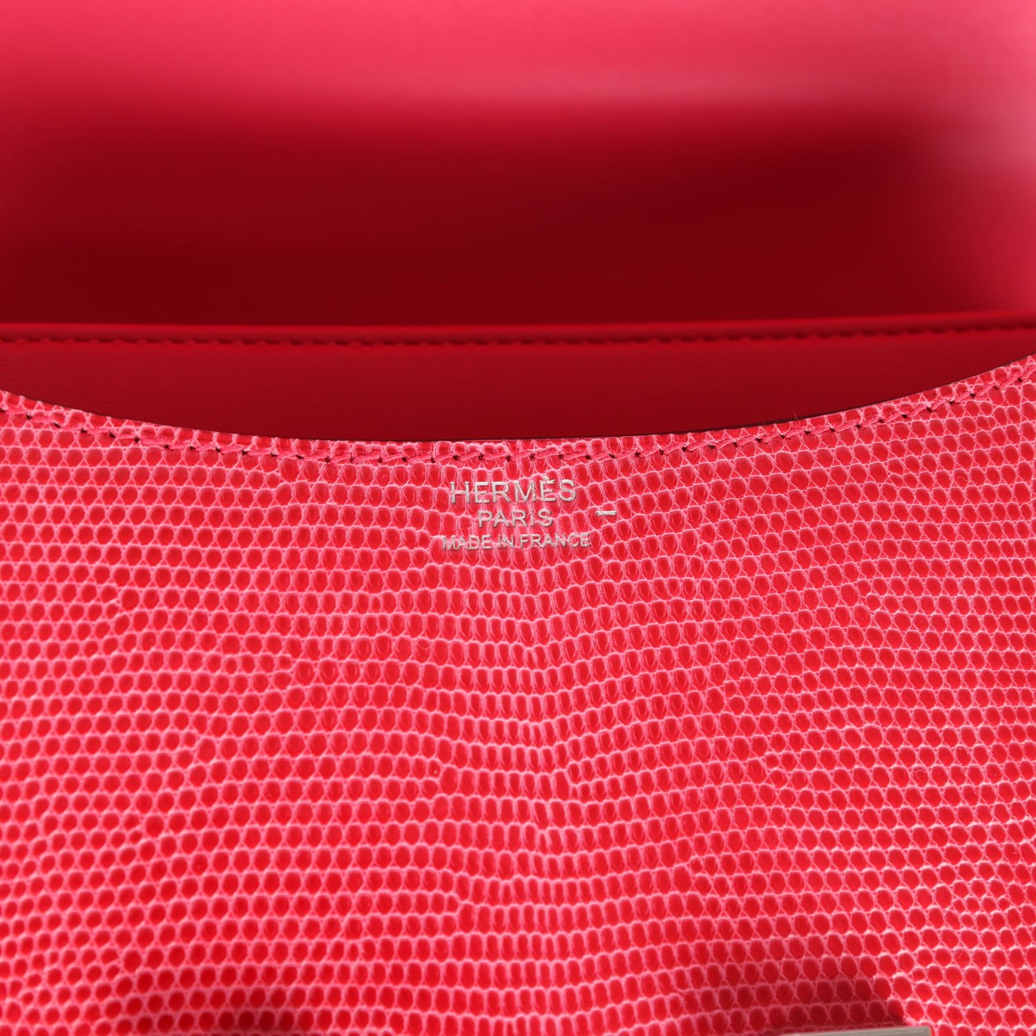 This Constance 24 is in Rose Extreme Shiny Varanus Niloticus Lizard leather with palladium hardware and has tonal stitching, a metal “H” snap lock closure and adjustable shoulder strap.