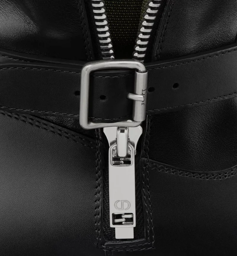 New for Cruise 2025, the D-Major boot gives a modern look to a bold design. The black calfskin upper features a zip closure and two adjustable buckle straps revealing a khaki technical fabric lining with the Christian Dior Paris signature, allowing for varying styles by wearing it open or closed. Completed by a thick notched sole, the boot will lend a contemporary touch to any look.